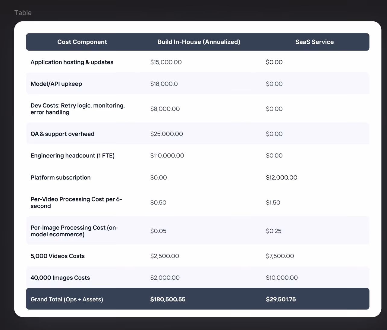 Even if API calls themselves are cheap - say, $0.05 per image or $0.50 per 6-second video — the hidden cost sits in the people maintaining it, the meetings about feature tweaks, and the growing backlog of “minor improvements.” The retailer’s leadership realized they were operating an internal SaaS product without meaning to.