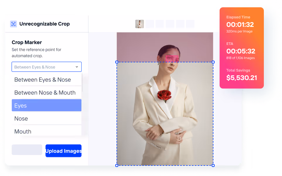 Crop.photo’s AI also knows how to crop faces at different markers including eyes, mouth, and nose, it can also detect body angles such as back shots and still crop them accurately. The AI's ability to perform this task quickly and accurately outperforms any manual retouchers, offering a more economical solution.