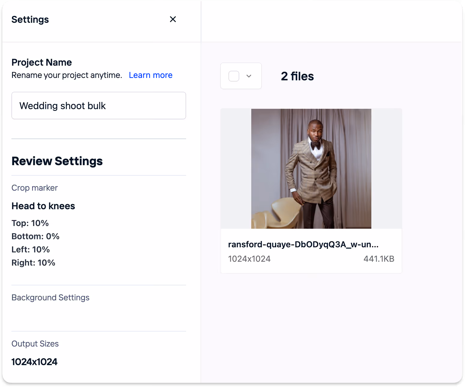 - Review and Start Cropping: Review the configuration on the left and once the files are uploaded, click "Start Crop" to kick off the automation
