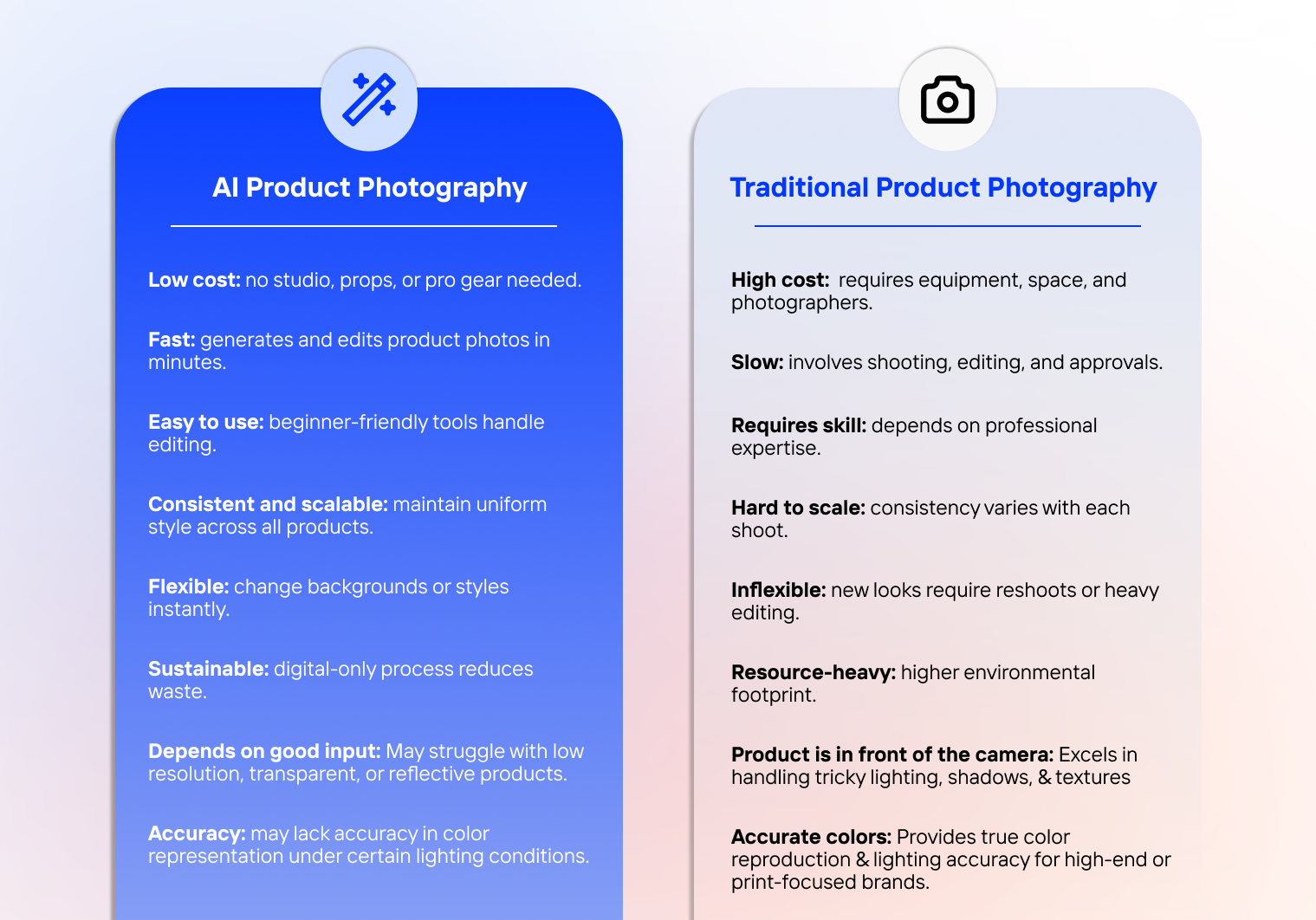 Traditional product photography meant hiring photographers, renting studios and waiting days for edited images. With AI in the mix you can create professional product images in minutes not days.