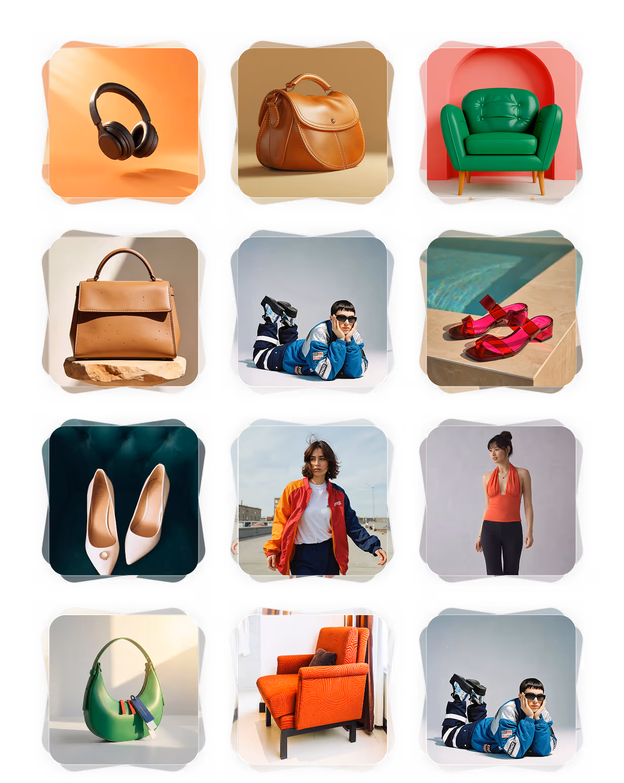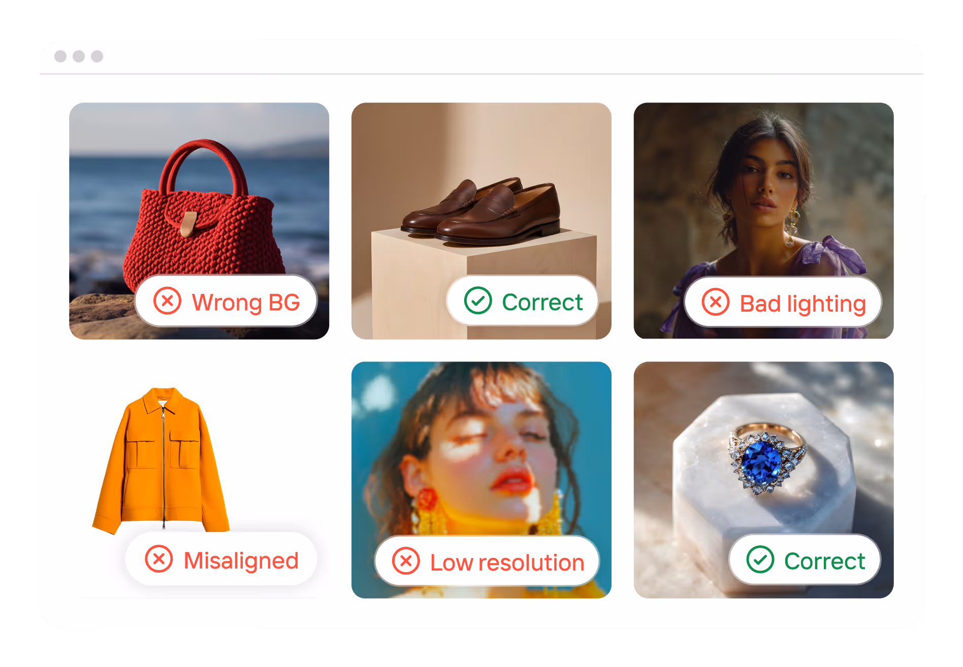 Every edit - crops, backgrounds, retouching, on-model images, video formats - follows your brand rules. Colors, framing, shadows, and sizing are controlled so your storefront stays consistent, no matter how big the batch.