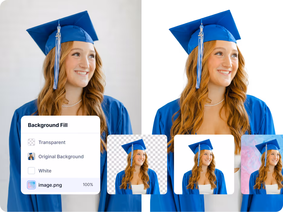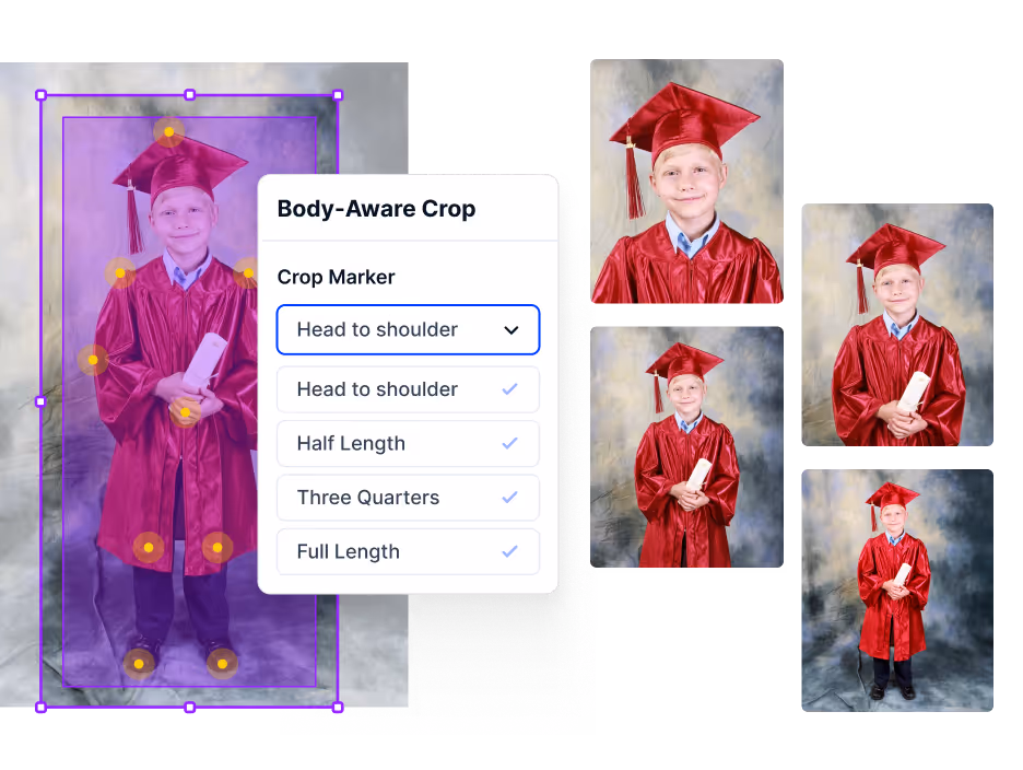 Transformez une seule photo en toutes les poses scolaires habituelles : recadrage de la tête aux épaules, recadrage à mi-longueur, trois-quarts et pleine longueur. Fini les cheveux coupés, les parties du corps manquantes ou les coupes maladroites. Gagnez des heures en élimination du besoin de prises de vue multiples et réglages manuels. Offrez une qualité constante à des milliers d'étudiants.