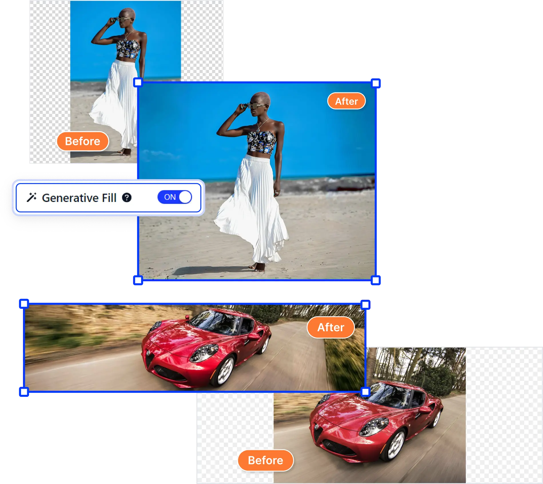 Generative AI to extend backgrounds, making sure important visual elements like limbs and props are never awkwardly cropped